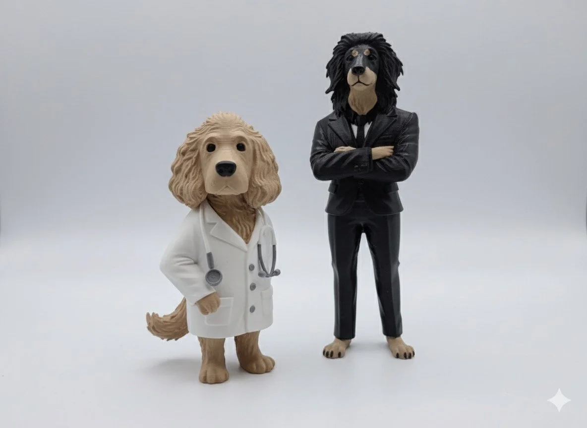 Stell dir vor, dein treuer Vierbeiner wird zum Superhelden, Arzt, Chef oder Astronaut! Wir verwandeln dein Haustier in eine einzigartige Figur, die du stolz zu Hause aufstellen kannst.